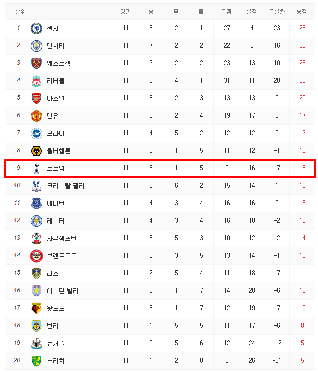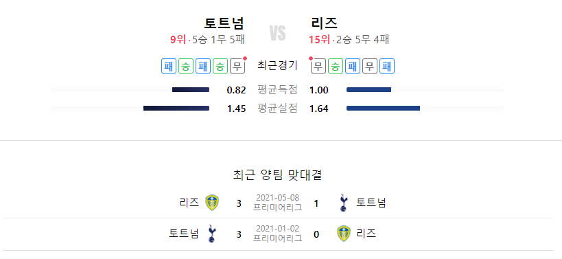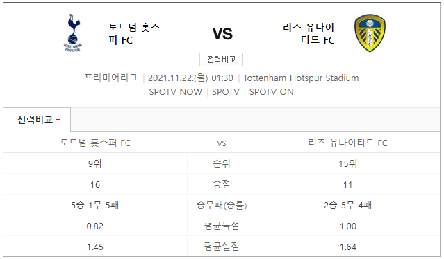 토트넘은 현재 5승 1무 5패로 리그 9위를 달리고 있고, 리즈 유나이티드는 2승 5무 4패로 15위에 랭크되어 있습니다.