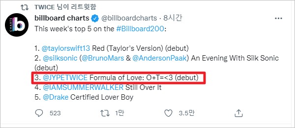 걸그룹 트와이스(TWICE)가 미국 빌보드 3대 메인차트인 <빌보드 200> 차트에서 3위에 오르면 최고 기록을 달성했습니다. 빌보드 공식 SNS 채널에 따르면, 트와이스가 11월 12일 발매한 정규 3집 앨범 ‘포뮬러 오브 러브: O+T=<3’(Formula of Love: O+T=<3)가 빌보드 메인 차트인 빌보드 200에서 3위를 차지했다고 밝혔습니다.