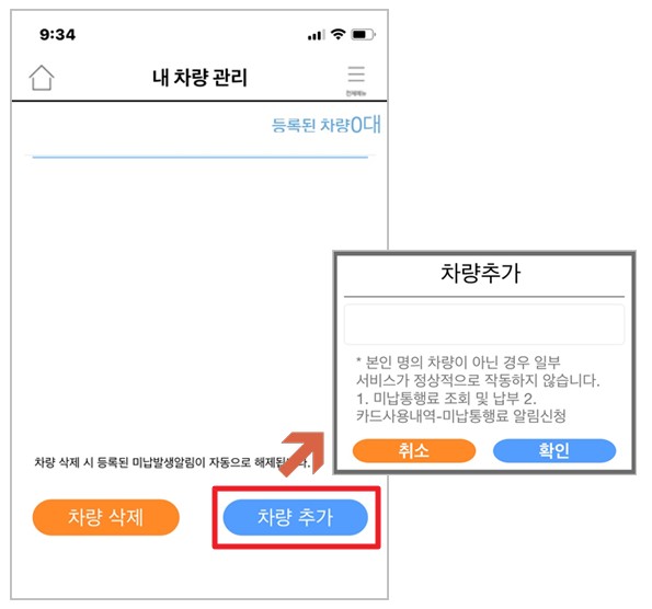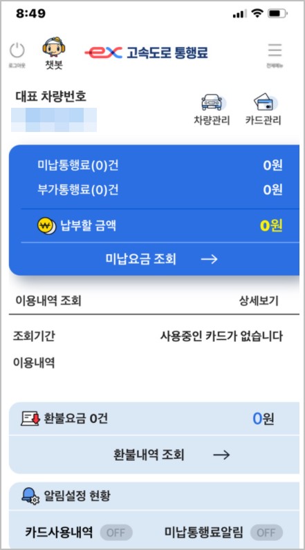 로그인을 완료하면 위와 같이 고속도로 통행료 미납상태를 확인할 수 있는데 [차량관리]에 들어가서 차량 번호만 넣고 추가하면 하이패스 미납요금을 바로 확인하고 납부할 수 있습니다.