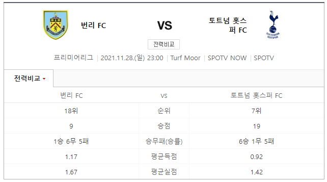 최근 좋은 경기력을 보이고 있는 손흥민은 이번 번리전이 특별한데 지난해 국제축구연맹 푸슈카상을 받았던 원더골의 상대팀이 바로 번리라는 점입니다. 또한 토트넘의 주전공격수인 해리케인도 무라전에서 골을 넣는 등 득점력이 살아나고 있는 만틈 상대적으로 득점력(경기당 0.92)에 비해 수비력(경기당 1.42)이 떨어지는 있는 번리전에서 좋은 결과를 기대할 만 합니다.