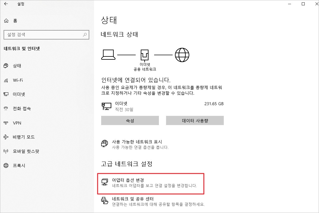 어댑터 옵션 변경 메뉴를 클릭해 줍니다.