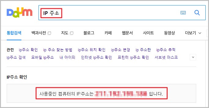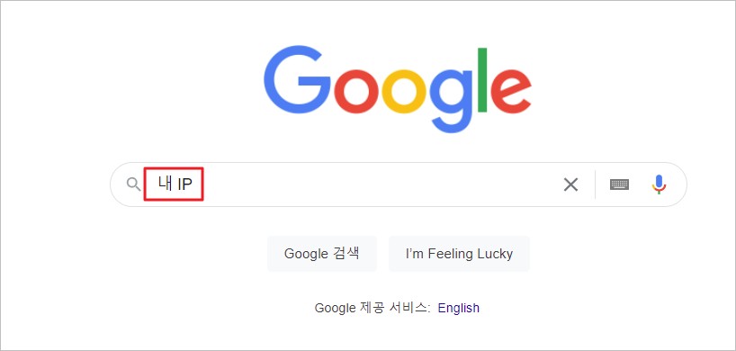 구글에서 "내 IP" 라고 검색한 후 검색 결과에서 <아이피 확인>을 클릭하면 자신의 IP 주소를 바로 확인할 수 있습니다.