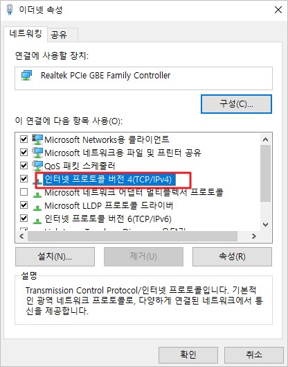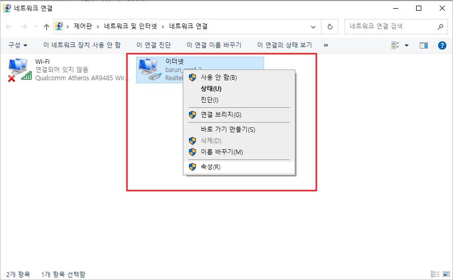 네트워크 연결에서 이더넷에 마우스 우클릭 후 하단 속성값을 들어가 줍니다.