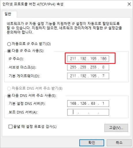 이더넷 속성값에서 네번째 인터넷 프로토콜 버전 4(TCP/IPv4)를 더블클릭 해주면 창이 뜨면서 아이피 번호가 표시됩니다.