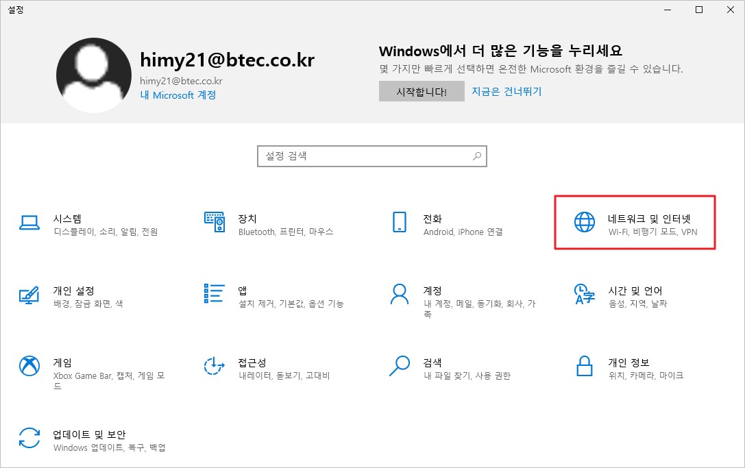 설정에서 네트워크 및 인터텟 메뉴를 클릭해 줍니다.