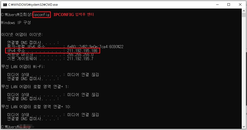 2. CMD 명령어를 통한 IP 주소 확인하기 (고정 IP 사용시)