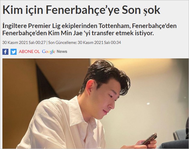 영국 프리미어리그 토트넘 훗스퍼가 김민재(페네르바체)의 영입을 위해 물밑 접속을 시도하고 있다는 소식이 전해진 가운데 대한민국 국가대표 손흥민(토트넘 훗스퍼)이 나섰다는 터키 언론의 보도가 나오고 있습니다.