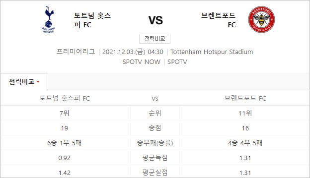 손흥민 소속팀인 토트넘 훗스퍼와 브렌트포드가 12월 03일(금) 04:30분에 토트넘 훗스퍼 스타디움에서 영국 프리미어리그(14라운드) 경기를 펼칩니다. 지난 13라운드 번리전이 현지 폭설로 인해 연기된 만큼 토트넘 선수들은 충분한 휴식을 취한 만큼 부상 선수를 제외한 주전 대부분이 출전할 것으로 예상되고 손흥민 역시 선발 출전이 유력합니다.