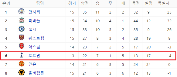 하지만, 아직까지 해리 케인 선수가 본모습을 찾지 못하고 있는 상황은 우려스러운 상황이고, 공격력에 비해 로메로의 부상 등 상대적으로 떨어지는 수비력은 보완이 필요해 보입니다.