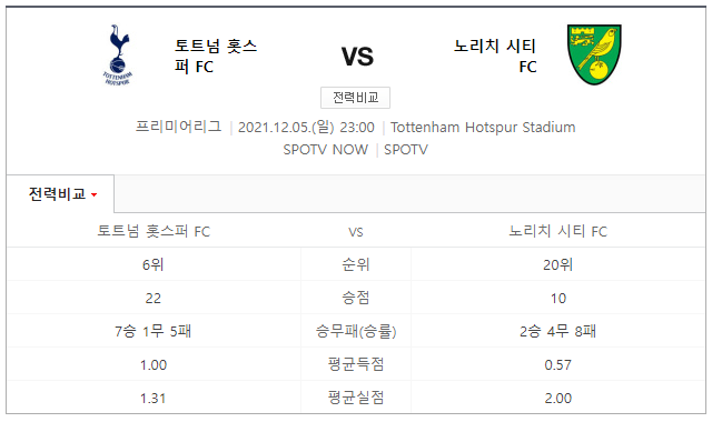 토트넘은 현재 7승 1무 5패 승점 22점으로 리그 6위를 달리고 있으며, 상대하는 노리치 시티는 2승 4무 8패로 리그 최하위인 20위를 달라고 있는 팀입니다.