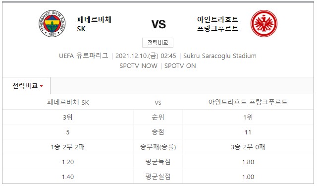 김민재 선수가 뛰고 있는 터키 페네르바체와 독일의 명문구단 프랑크푸르트가 12월 10일(금) 02:45분 페네르바체의 홈구장인 쉬크뤼 살라졸루 스타디움에서 2021/22 UEFA 유로파리그 6차전을 갖습니다. 지난 유로파리그 5차전까지 교체 없이 모두 선발로 출전해 안정적인 수비를 보인 김민재는 이번 프랑크푸르트와의 경기에도 설 발출장이 유력한 상황입니다.